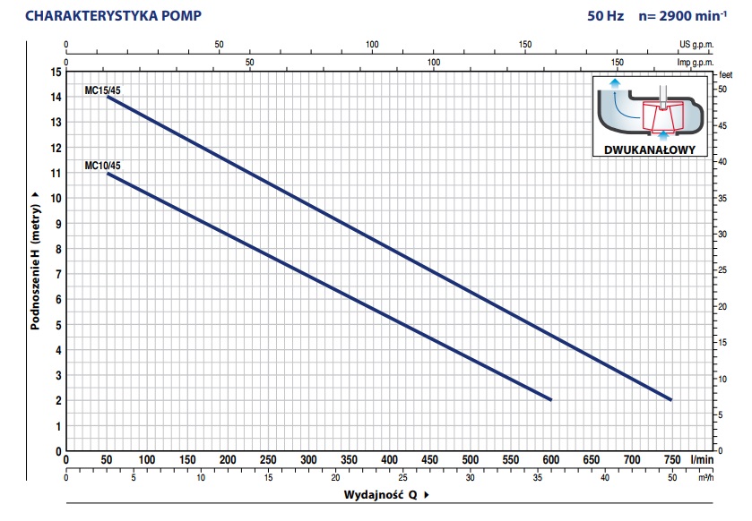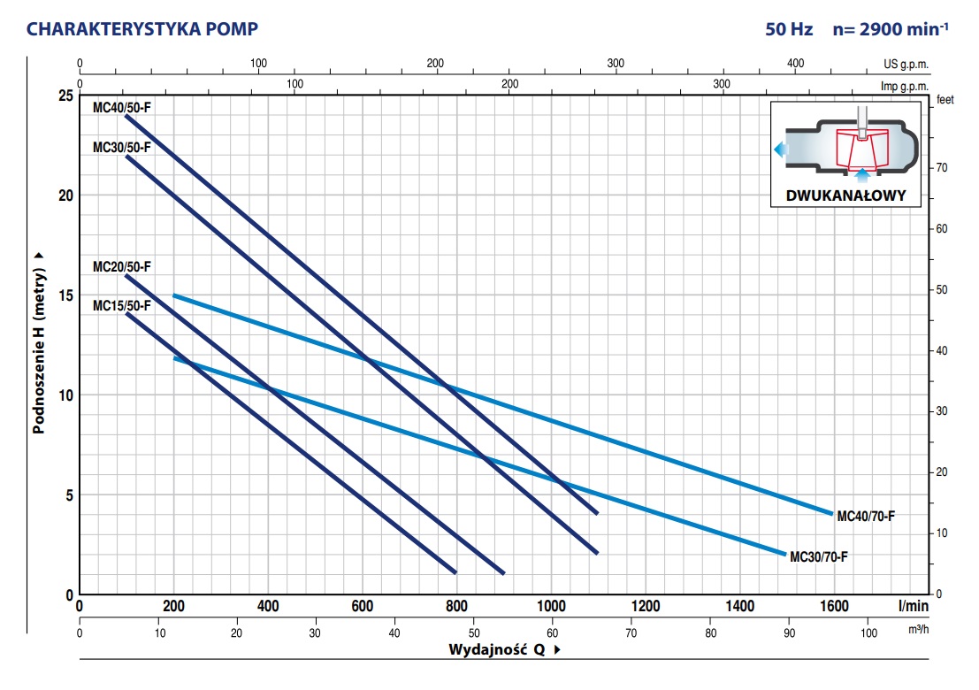 Pompa zatapialna z żeliwnym korpusem, z wirnikiem dwukanałowym ze stali nierdzewnej (AISI 304), z łącznikiem pływakowym (tylko dla wersji jednofazowej) i kablem 10 metrów. Pompy serii MC-Fdoskonale nadają się do odprowadzania wody brudnej i ścieków. Wykonane z wytrzymałego żeliwa o dużej grubości, odporne na długotrwałe ścieranie, są wyposażone w wirnik dwukanałowy i są zdolne do pompowania cieczy zawierających zawiesinę o krótkich włóknach. Idealnie nadają się do pompowania ścieków, wody zmieszanej z błotem, wód gruntowych i powierzchniowych w miejscach takich jak bloki mieszkalne, budynki użyteczności publicznej, fabryki, parkingi wielopoziomowe i podziemne, myjnie itp.