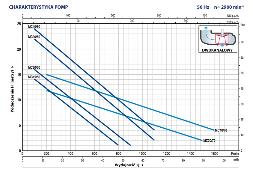 Pompa zatapialna z żeliwnym korpusem, z wirnikiem dwukanałowym ze stali nierdzewnej (AISI 304), z łącznikiem pływakowym (tylko dla wersji jednofazowej) i kablem 10 metrów. Pompy serii MCdoskonale nadają się do odprowadzania brudnej i ściekowej wody w zastosowaniach domowych i budownictwa. Są one wyposażone w dwukanałowy wirnik ze stali nierdzewnej i są zdolne do pompowania cieczy zawierających zawiesinę o krótkich włóknach o średnicy do 50 mm. Są idealne do pompowania brudnej wody, ścieków, wód powierzchniowych i wody zmieszanej z błotem w miejscach takich jak bloki mieszkalne i domy jednorodzinne