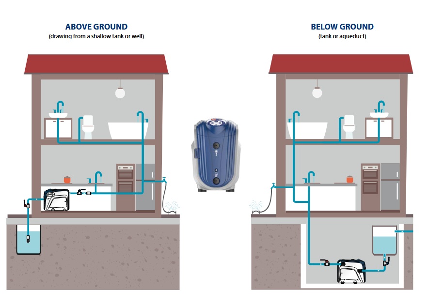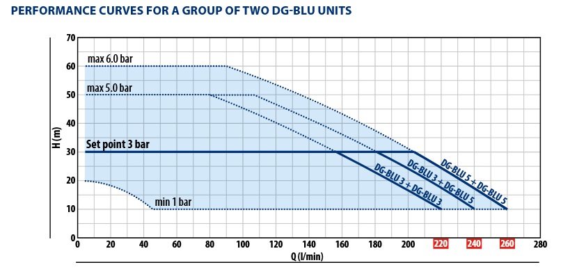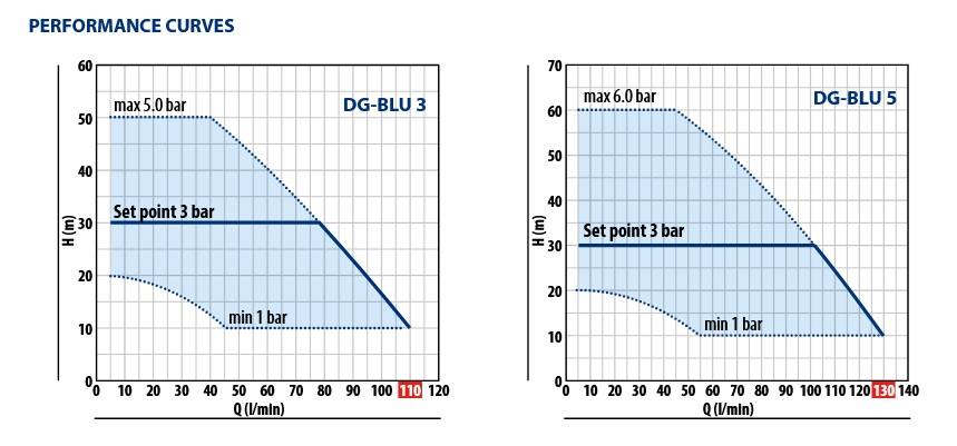 Urządzenia DG-BLU to automatyczny system podnoszenia ciśnienia z falownikiem składający się z wydajnej, samozasysającej, wielowirnikowej pompy elektrycznej, zbiornika, czujników ciśnienia i przepływu oraz zaworu zwrotnego. Napięcie zasilania 1-230V.